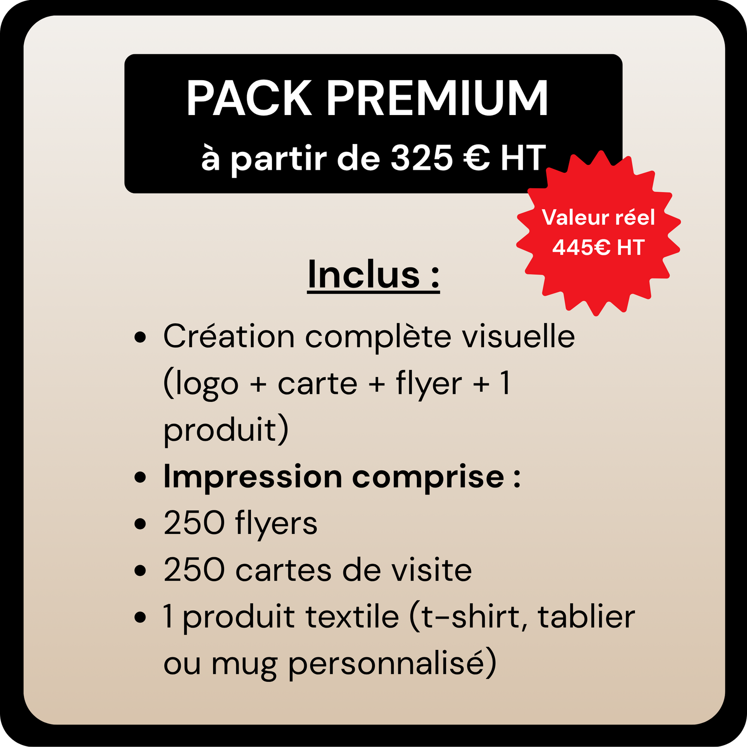 Nous avons créé des packs "clés en main" pour lancer votre image de marque rapidement : logo + flyers + textiles personnalisés imprimés.